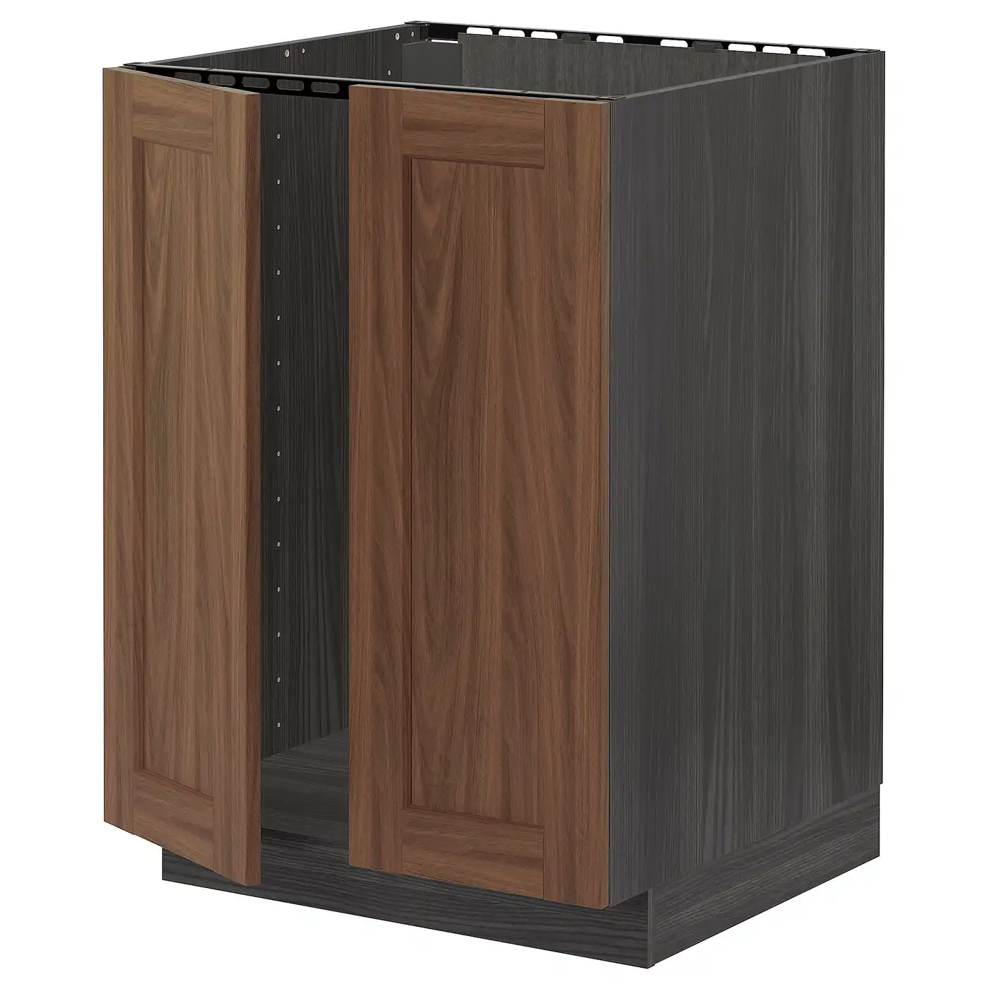 METOD Base cabinet for sink + 2 doors - black Enköping/brown walnut effect 60x60 cm