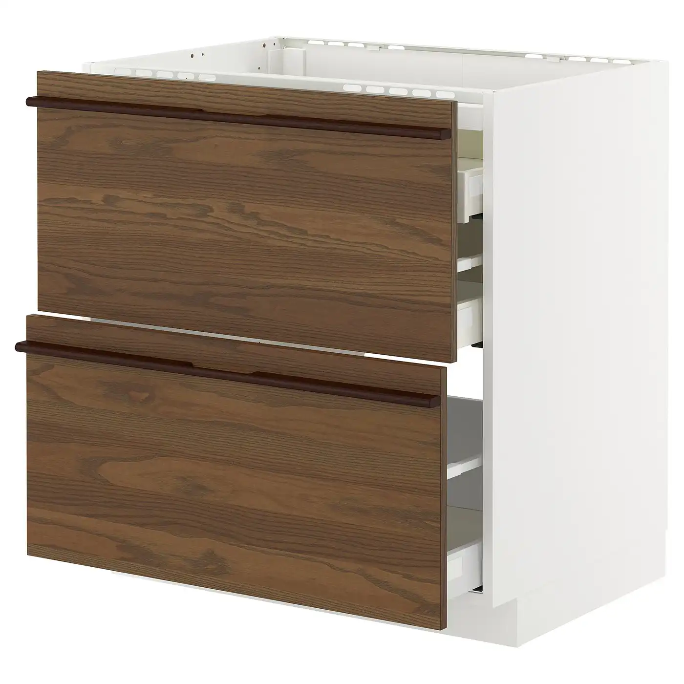 METOD / MAXIMERA Base cab f hob/2 fronts/3 drawers - white/Stensta dark brown ash veneer 80x60 cm