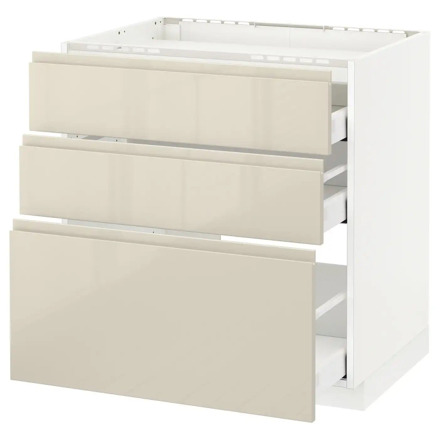 METOD / MAXIMERA Base cab f hob/3 fronts/3 drawers - white/Voxtorp high-gloss light beige 80x60 cm