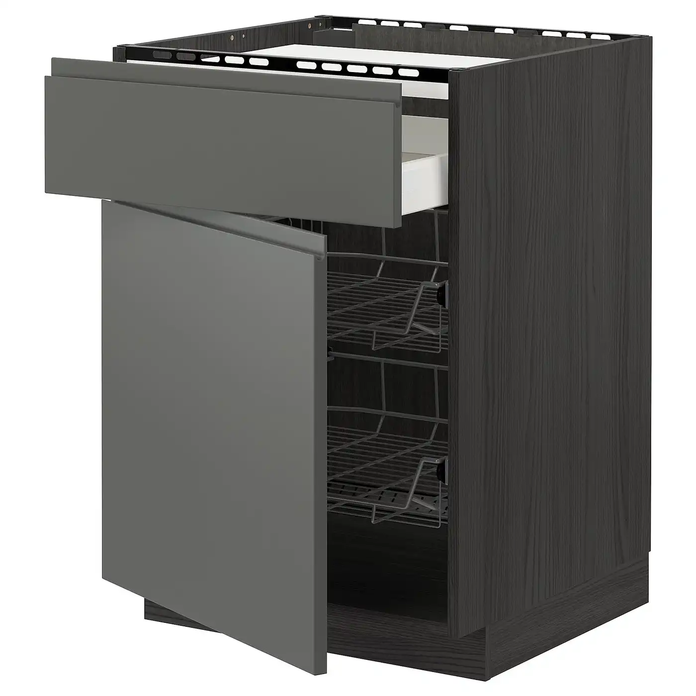 METOD / MAXIMERA Base cab w wire basket/drawer/door - black/Voxtorp dark grey 60x60 cm