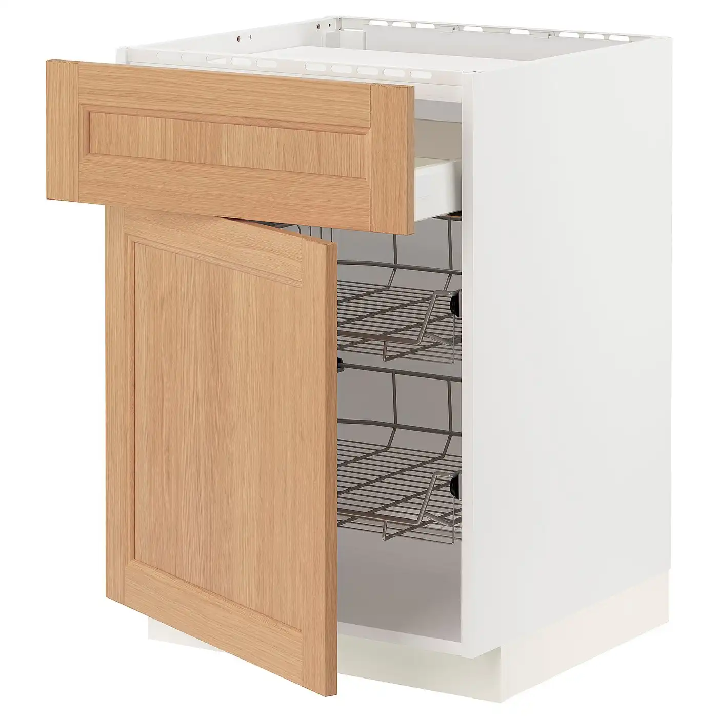 METOD / MAXIMERA Base cab f hob/drawer/2 wire bskts - white/Vedhamn oak 60x60 cm