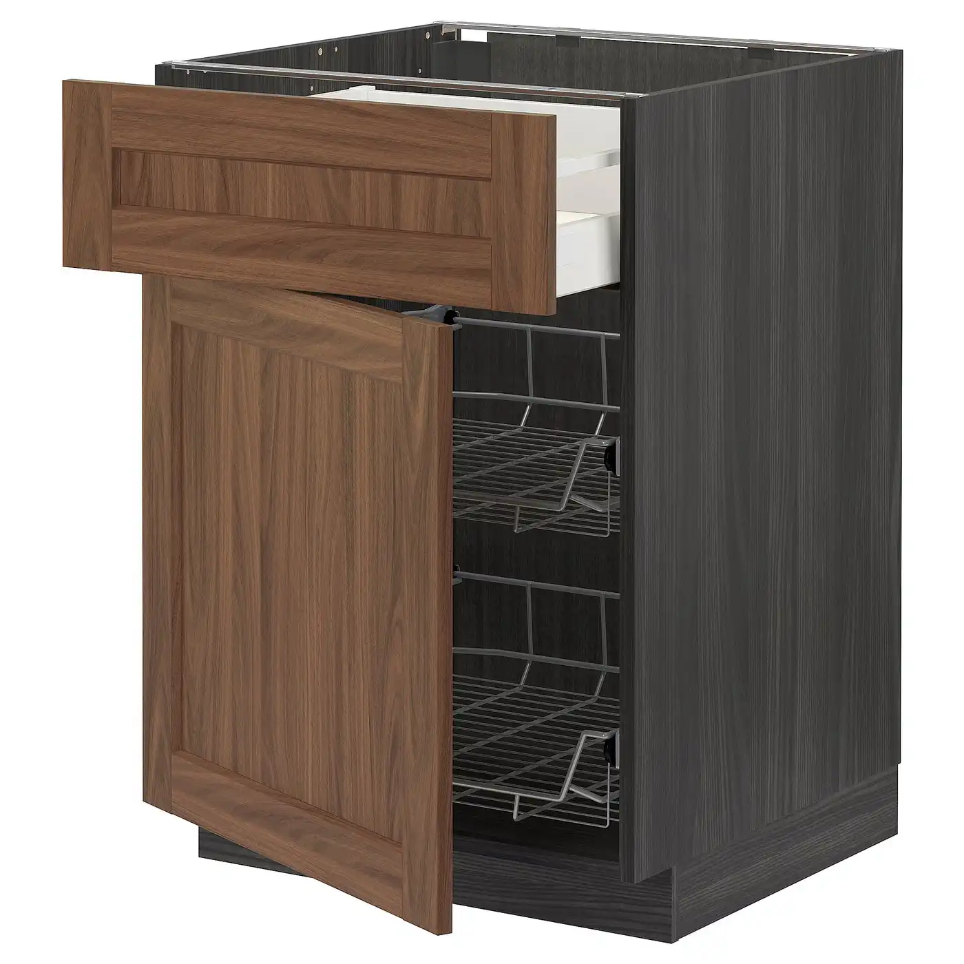 METOD / MAXIMERA Base cab w wire basket/drawer/door - black Enköping/brown walnut effect 60x60 cm