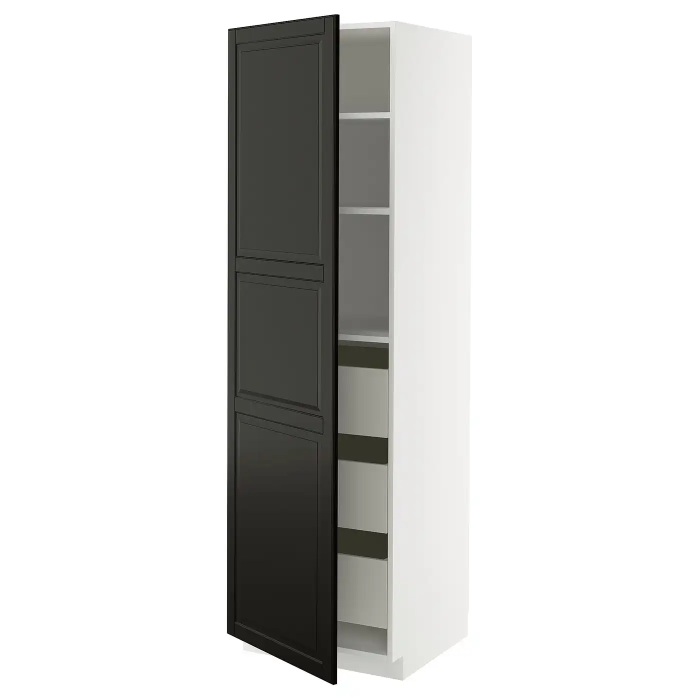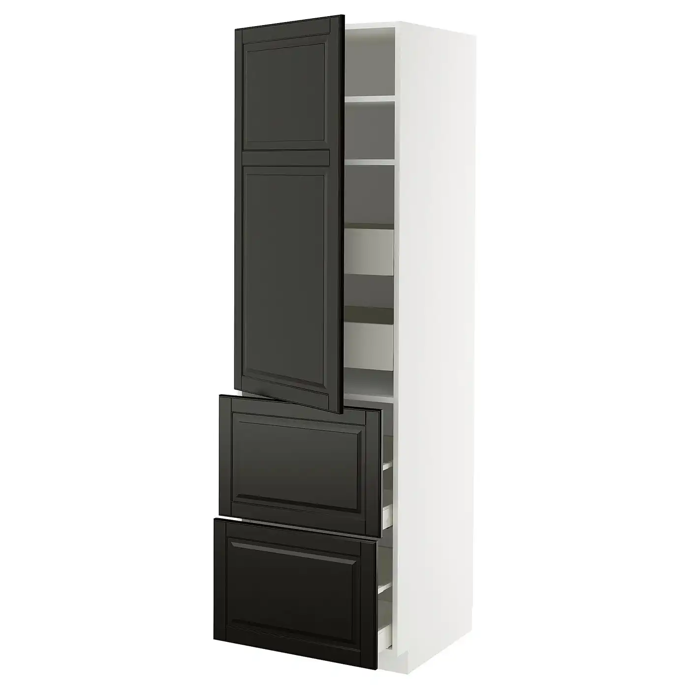 METOD / MAXIMERA Hi cab w shlvs/4 drawers/dr/2 frnts - white/Bodbyn black 60x60x200 cm