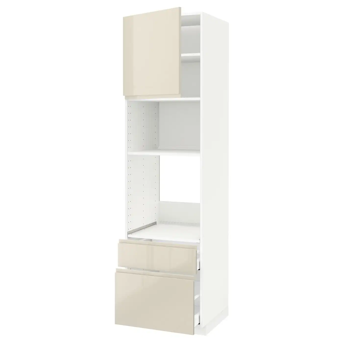 METOD / MAXIMERA High cab f oven/micro w dr/2 drwrs - white/Voxtorp high-gloss light beige 60x60x220 cm