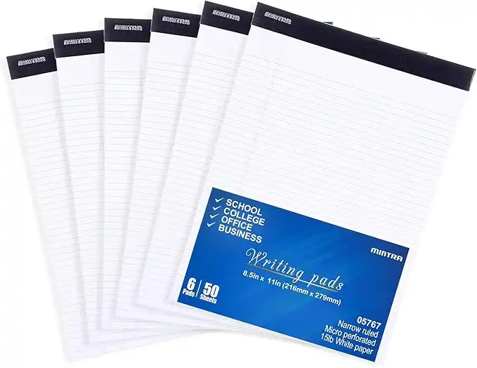 Mintra Basic White Writing Notepad, 50 Sheets, Pack of 6, Narrow Ruled Paper, 21.5 x 28 cm