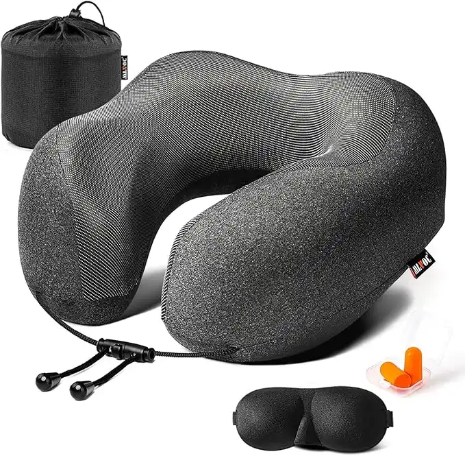 MLVOC Travel Pillow 100% Pure Memory Foam Neck Pillow, Comfortable & Breathable Cover, Machine Washable, Airplane Travel Kit with 3D Contoured Eye Masks, Earplugs, and Luxury Bag, Standard (Black)