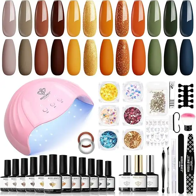 Modelones 35 Pcs Fall Gel Nail Polish Kit with U V Light 48W dryer Lamp, 12 Colors Orange brown Gel Manicure Kit Base&Top Coat Nail Glitters Striping Tools Salon DIY Home Decoration Gift