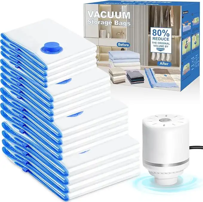 MOMENT 16 Pack Vacuum Compression Storage Bags with Electric Pump (4 Jumbo, 4 Large, 4 Medium, 4 Small), Space Saver Bag Reusable Sealer Bags for Clothes, Bedding,Mattress, Blanket, Pillows