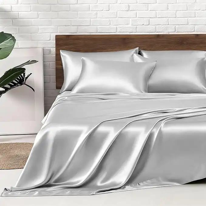 MR&HM Satin Bed Sheets, King Size Sheets Set, 6 Pcs Silky Bedding Set with 15 Inches Deep Pocket for Mattress (King, Silver Grey)