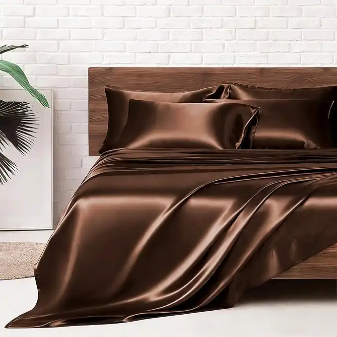 amazon.aeMR&HM Satin Bed Sheets, Queen Size Sheets Set, 6 Pcs Silky Bedding Set with 15 Inches Deep Pocket for Mattress (Queen, Brown)