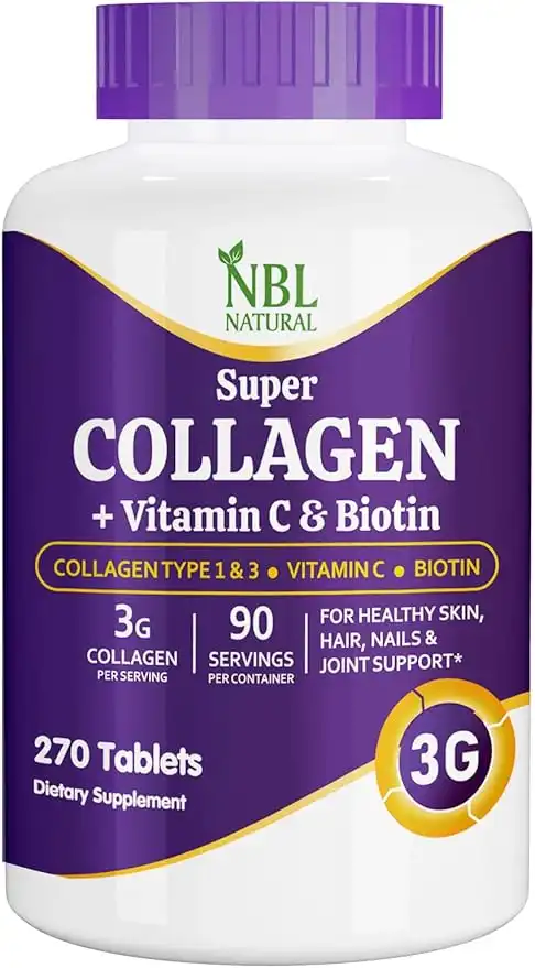 NBL Natural Super Collagen Tablets – 270 Tablets – Collagen Type 1 & 3 with Vitamin C & Biotin – 3g Per Serving – Supports Hair, Skin, Nails & Joint Health – 90 Servings