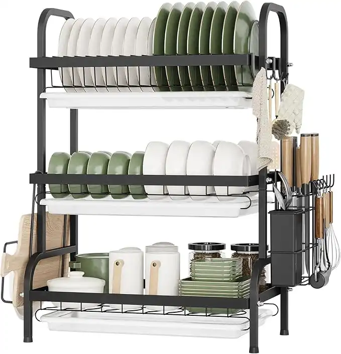 amazon.aeNETEL 3-Tier Dish Drying Stand, Large Capacity Dish Drainer Rack with Drainboard & Drip Tray, 56 cm W Carbon Steel Space-saving for Kitchen Organizer Counter, Plates Organizer with Utensil Holder