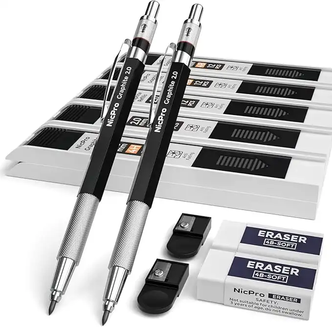 amazon.aeNicpro 2mm Metal Mechanical Pencil Set, 2PCS Lead Holder 2.0 mm Marker Artist Carpenter Pencils with 120 Graphite Lead Refill (HB 2H 4H 2B 4B & Color), 2 Eraser for Drafting, Drawing Writing Sketching