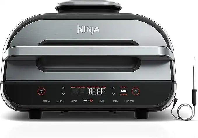 Ninja | Indoor Grill and Air Fryer| Foodi Smart XL | 6-in-1 Grill, Air Fry, Roast, Bake, Broil, Dehydrate & Crisp |Smart Thermometer & Splatter Shield | Dishwasher Safe Parts | Black/Silver | FG551