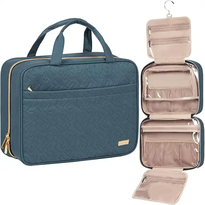 NISHEL Travel Toiletry Bag for women, Portable Hanging Organizer for Full-Sized Shampoo, Conditioner, Brushes Set, Travel-Size Accessories