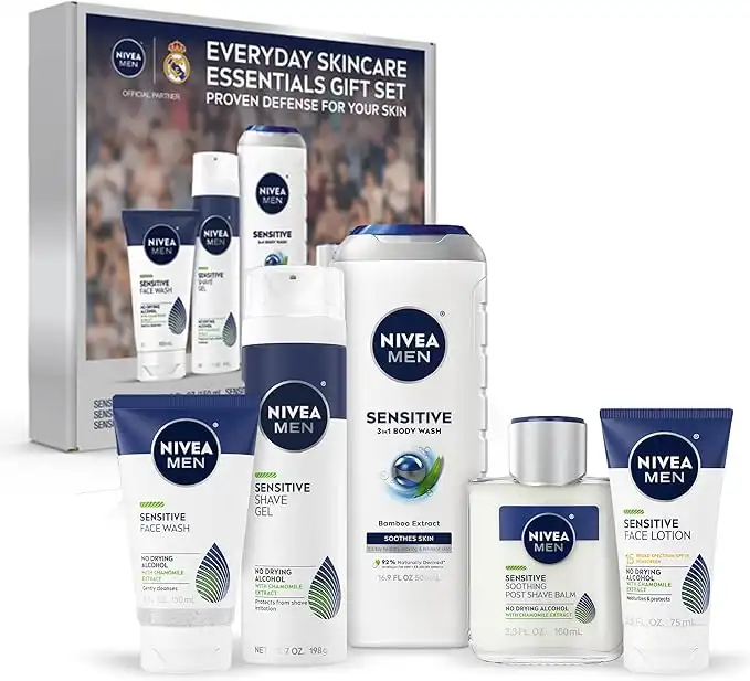 amazon.aeNivea Men Sensitive Skin Care Set For Men, Face Wash, 5 Fl Oz + Body 16.9 Shave Gel, 7 Soothing Post Balm, 3.3 Lotion Spf 15, 2.5