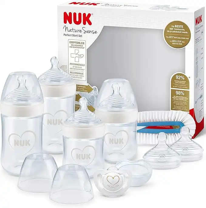 NUK Nature Sense Perfect Start Baby Bottles Set - 0-18 Months - Breast-Like Silicone Teat - 4 x Anti Colic Baby Bottles, Dummy, Bottle Brush & More - BPA-Free - 9 Count — Price History & Tracker | DeserTracker