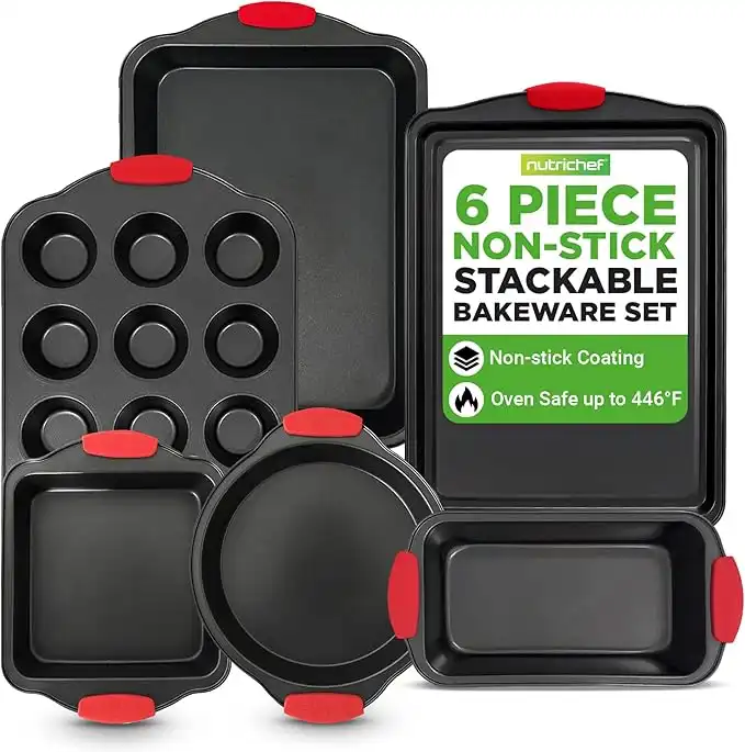 NutriChef 6-Piece Nonstick Bakeware Set - Carbon Steel Baking Tray Set w/Heatsafe Red Silicone Handles, Oven Safe Up to 450°F, Loaf Muffin Round/Square Pans, Cookie Sheet, Baking Pan -NCSBS6S,Black — Price History & Tracker | DeserTracker