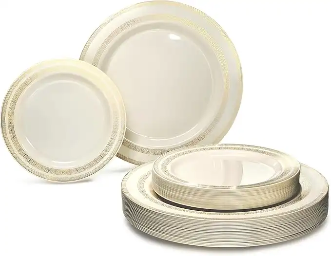 amazon.aeOCCASIONS FINEST PLASTIC TABLEWARE " 50 Plates Pack (25 Guests)-Heavyweight Wedding Party Disposable Plate Set -25 x 10.5'' Dinner + 25 x 7.5'' Salad/Dessert plates (Lace Ivory & Gold)