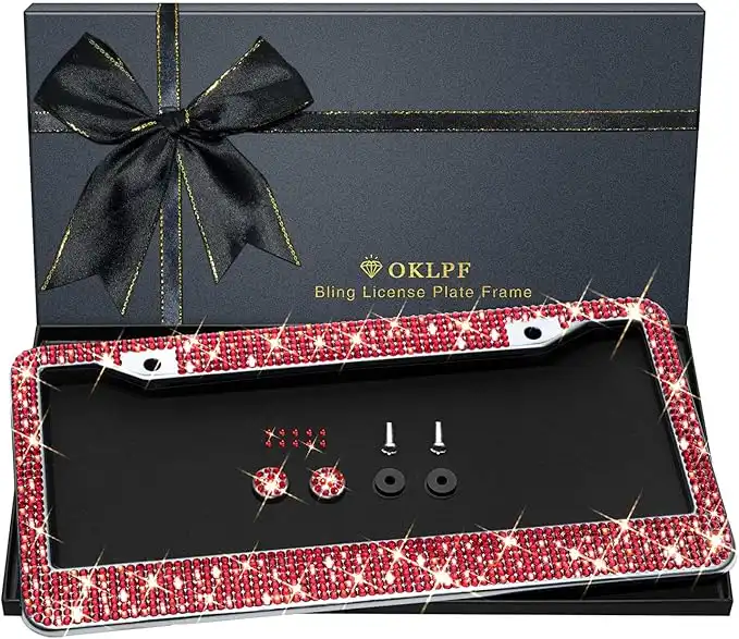 amazon.aeOKLPF Bling License Plate Frame for Women, Sparkly Stainless Steel License Plate Frames| Over 1200 pcs 14 Facets Bedazzled Clear Glass Diamond Rhinestone Crystals w/Free Glitter Diamond 1PCS Box (Red)