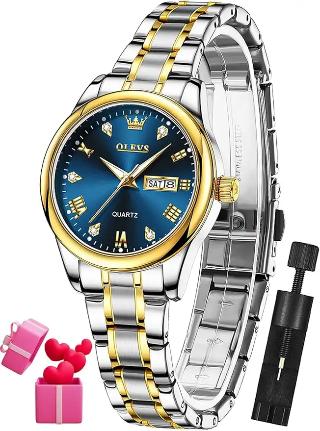 amazon.comOLEVS Women's Watch Gold Diamond Classic Elegant Dress Wrist Watch Stainless Steel Waterproof Day Date