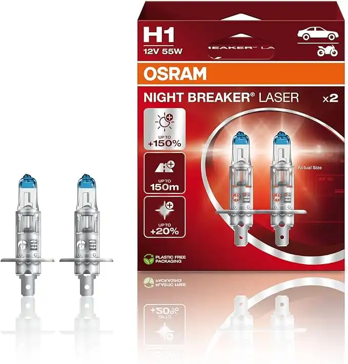 OSRAM NIGHT BREAKER LASER H1, next generation, 150% more brightness, halogen headlamp, 64150NL-HCB, 12V, passenger car, duo box (2 lamps)
