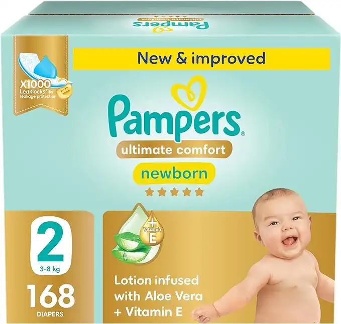 Pampers Ultimate Comfort Taped Diapers, Size 2, 3-8kg, Lotion infused with Aloe Vera and Vitamin E, x1000 Leak Locks Technology for Leakage Protection, Giant Saving Pack, 168 Count