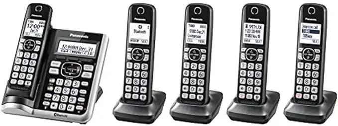 Panasonic Link2Cell Bluetooth Cordless Phone System with Voice Assistant, Call Block & Answering Machine, Battery Powered, Expandable Home Phone with 5 Handsets – KX-TGF575S (Black with Silver Trim)