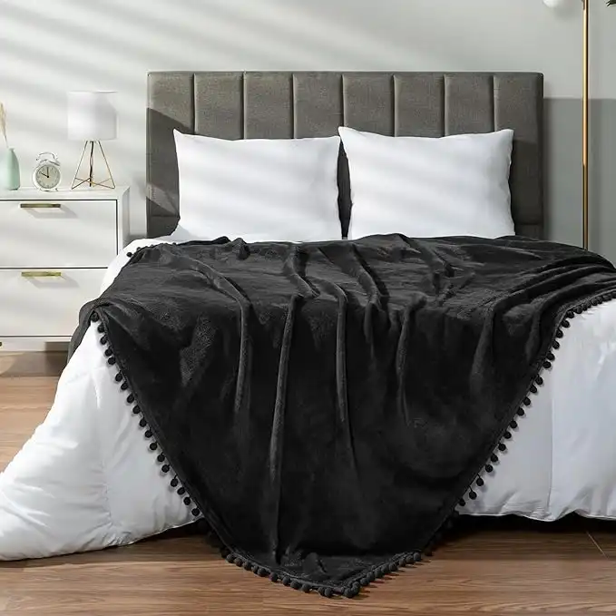 amazon.aePAVILIA Black Throw Blanket Pom Pom Twin Bed Couch Sofa, Fleece Soft Fuzzy Cozy Lightweight Pompom Fringe Blanket, Decorative Boho Room Home Decor Gift Flannel Velvet Throw, Dark Solid Black, 60x80