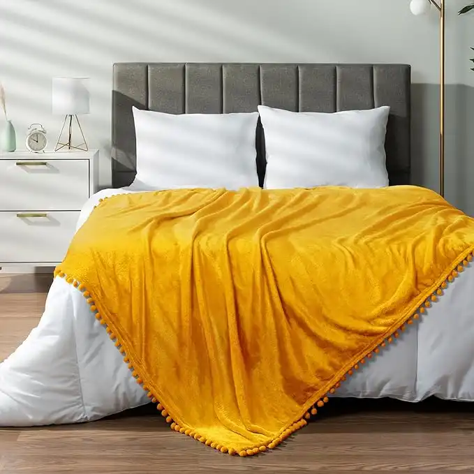 amazon.aePAVILIA Mustard Yellow Throw Blanket Pom Pom for Couch Bed Sofa, Fleece Soft Fuzzy Cozy Lightweight Pompom Fringe Blanket, Decorative Boho Room Home Decor Gift Flannel Velvet Throw, Gold Yellow, 50x60