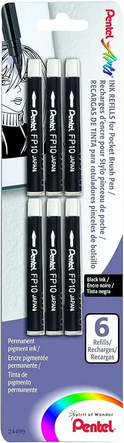 Pentel Arts Pocket Brush Refills, Black Ink, Pack of 6 (FP10BP6A)