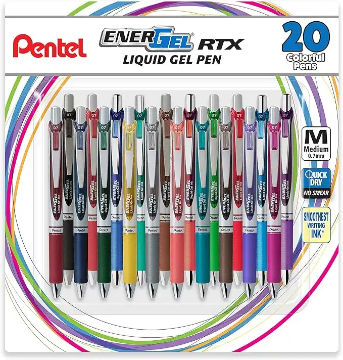Pentel Energel Rtx Retractable Liquid Gel Ink Pen, (0.7mm) Medium, Assorted Ink, 20 Pack (Bl77Bp20M),