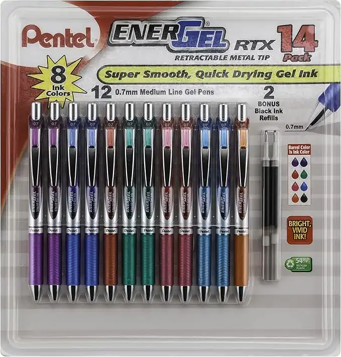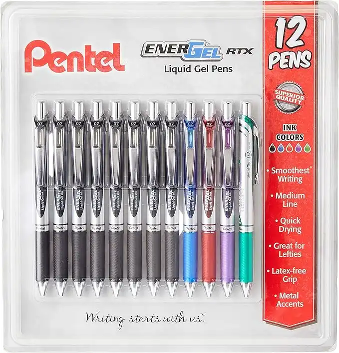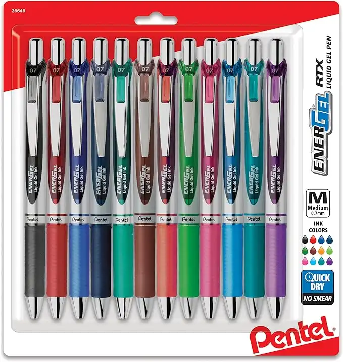 amazon.aePentel EnerGel RTX Retractable Liquid Gel Pen, 0.7mm Black/Blue/Red/Green/Violet Ink, 12 Pack (BL77O12C)