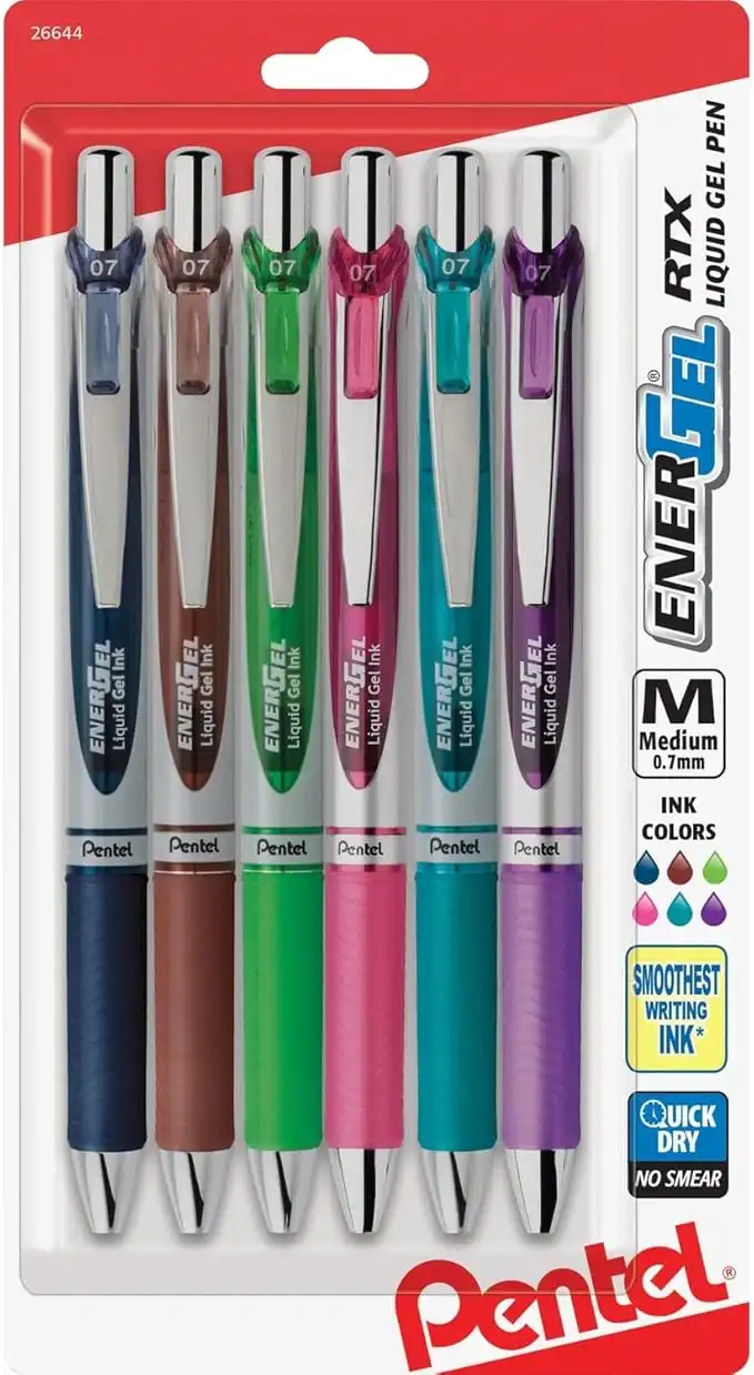Pentel EnerGel RTX Retractable Liquid Gel Pen, (0.7mm) Metal Tip, Medium Line, Assorted Ink, 6-Pk (BL77BP6M1)