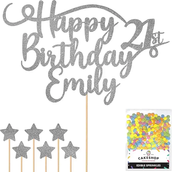 Personalised Happy Birthday Glitter Cake Topper | Custom Colour Any Name & Any Age Glitter Cake Decoration for 1st 10th 16th 18th 20th 21st 30th 40th 50th 60th 70th 80th (Dark Silver) — Price History & Tracker | DeserTracker