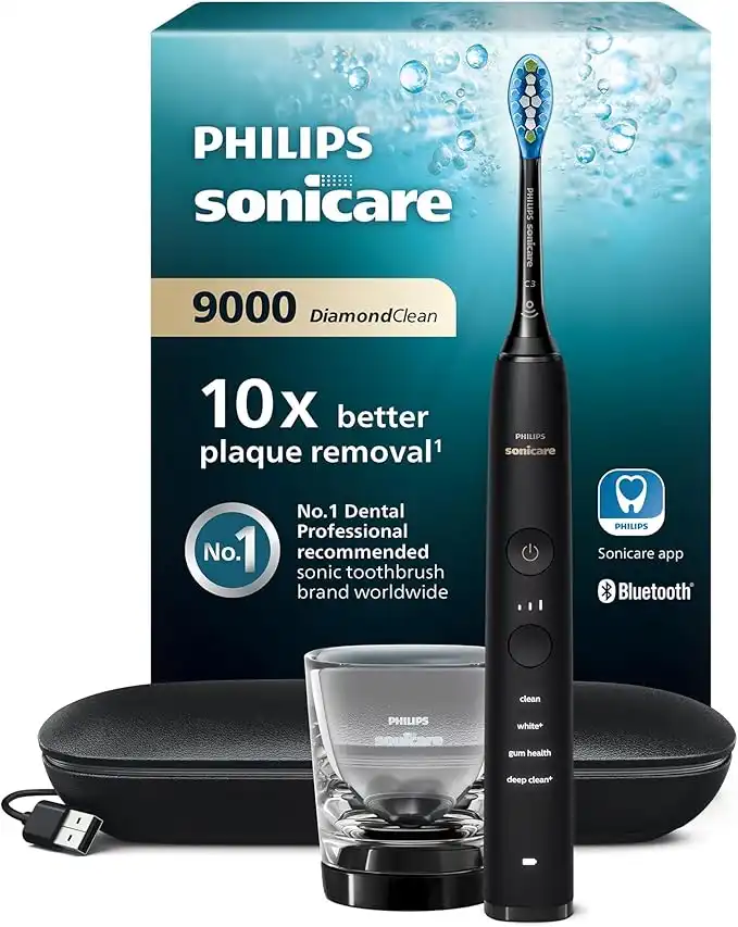 Philips Sonicare DiamondClean 9000 Electric Toothbrush with App, Pressure Sensor, 4 Brushing Modes, 3 Intensity Levels, Charging Glass, USB Travel Case, Black, HX9911/09