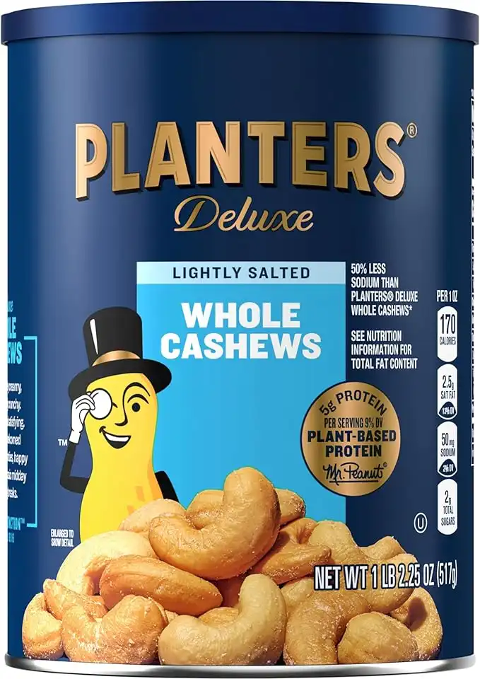 Planters Deluxe Lightly Salted Whole Cashews, 18.25oz. Resealable Canister - Lightly Salted Cashews & Lightly Salted Nuts - Nutrient Dense Snacks for Adults & Kids - Vegan Snacks, Kosher