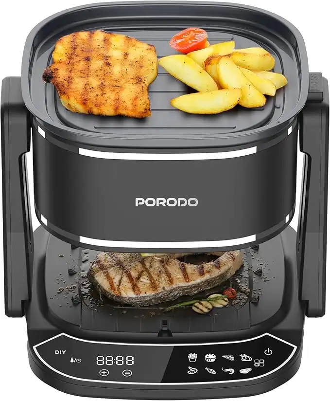 Porodo Air Fryer And Grill Combo with Glass Container, 8-IN-1 Touch Panel, 4.5L Electric Smokeless, 200°C Max, 360° View Glass Pot, Roast, Bake & Dehydrate, Adjustable Temps, Non Stick - Easy Clean