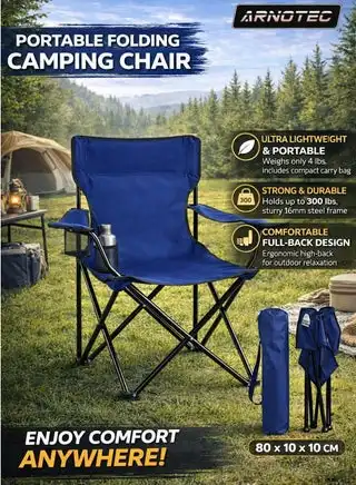 Portable Folding Camping Chair with Carry Bag – Lightweight Outdoor Chair for Camping, Beach, Hiking, Picnic & Sports – Heavy-Duty Steel Frame, 300lbs Capacity, Full-Back Support