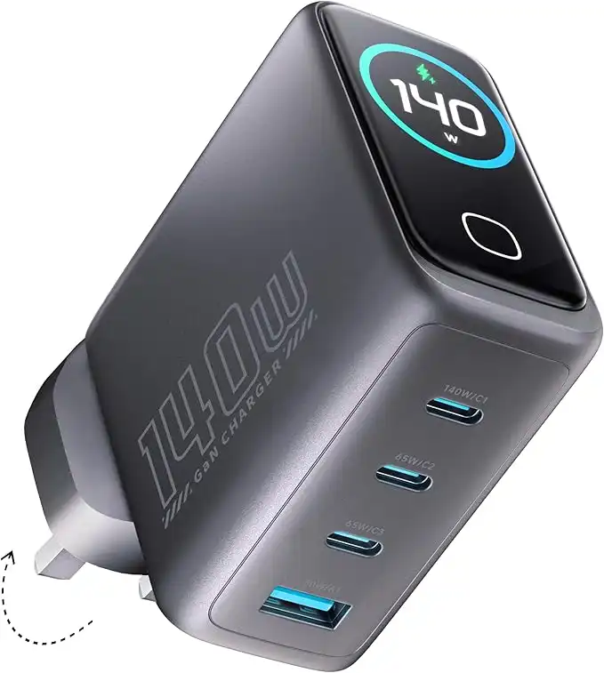 Powerology VoltFlows 140W GaN Charger with Display & AVS Protocol, 1× USB-A & 3× PD Type-C Ports, 4-Port Multi Device Fast Charging, 140W Fast Charger with TFT Screen, Ideal for iPhone 17 & Laptops