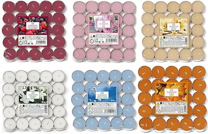 Price's Aladino 150 Tea Lights Candles Scented Tealights- 25 x 6 Scents Mixed Pack - Cotton Flowers, Mixed Berries, Citrus, Rose, Lavender & Cinnamon