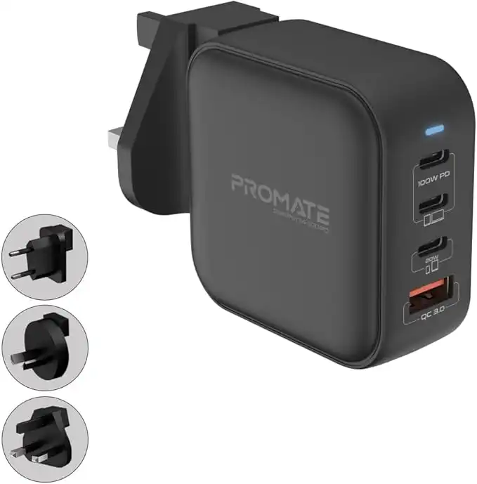 Promate GaN USB-C Charger, 100W GaN Technology Fast Dual Type-C Power Delivery Laptop Charger with 20W Power Delivery USB-C Port, 18W QC 3.0 Port, Multi-Regional Plugs for MacBook Pro, GaNPort4-100PD