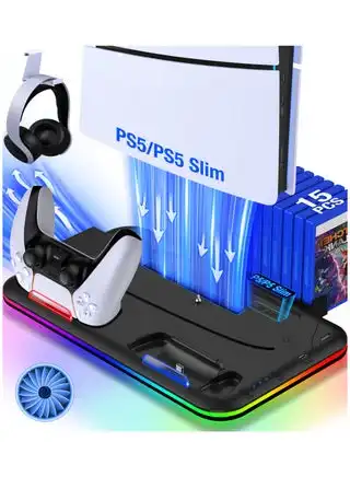 PS5 Stand, PS5 Slim Stand with Cooling Station and Controller Charging Station for PS5 Slim Console Disc/Digital, PS5 Accessories-Cooling Fan, RGB LED, Headset Holder, 15 Game Slot for Playstation 5 — Price History & Tracker | DeserTracker