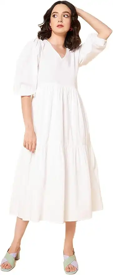Puff Sleeves Tiered Fit & Flare Midi Dress for Women