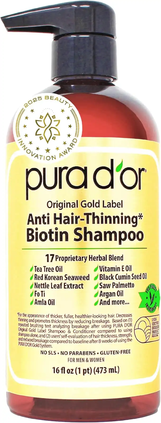 pura d'or Original Gold Label Anti-Thinning Shampoo Clinically Tested, Infused with Argan Oil, Biotin & Natural Ingredients, Sulfate Free, All Hair Types, Men and Women, 16 Fl Oz (Packaging may vary)