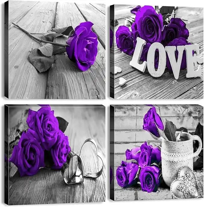 amazon.aePurple Bedroom Decor Rose Flower Wall Art Black and White Canvas Prints Picture 12 x 12" 4Pcs Romantic Floral Poster Modern Artwork Painting Couple Gift Living Room Bathroom Office Home Decoration