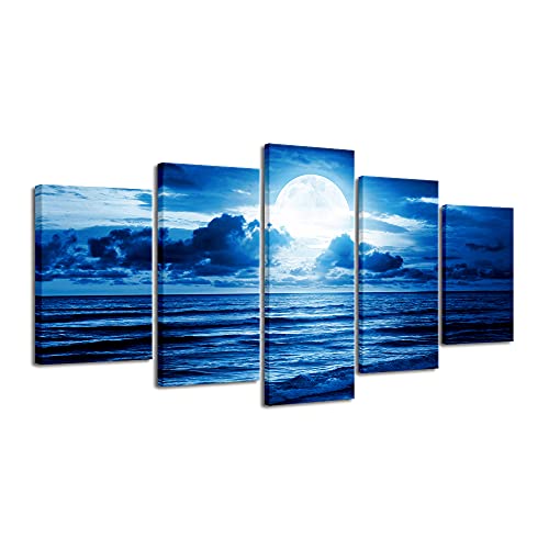 Pyradecor Extra Large Blue Clouds 5 Panels Moon Sea Beach Canvas Wall Art Modern Landscape Canvas Prints Pictures Artwork for Living Room Bedroom Home Decorations AH5003-XL