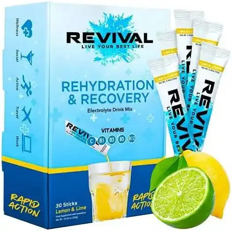 Revival Shots Rapid Rehydration Electrolytes Powder - High Strength Vitamin C, B1, B3, B5, B12 Supplement Sachet Drink, Effervescent Electrolyte Hydration Tablets - 30 Pack Lemon Lime