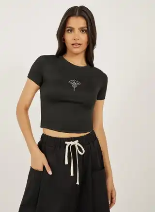 Rhinestone Embellished Cropped Fitted T-Shirt