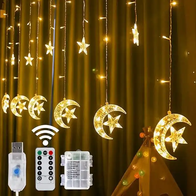 Rness Star Moon Window Curtain String Lights 138 LED, USB Plug with Remote Control, 8 Lighting Modes for Home Eid Al Adha Mubarak Decorations Ramadan Party Patio Lawn(Warm White)